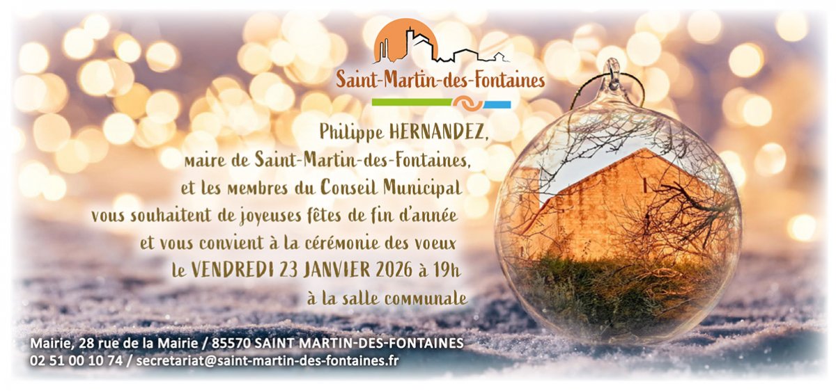 Philippe HERNANDEZ, Maire de Saint Martin des Fontaines, et les membres du Conseil Municipal vous souhaitent de joyeuses fêtes de fin d'année et vous convient à la cérémonie des voeux le vendredi 23 janvieer 2026 à 19h00 à la salle communale.